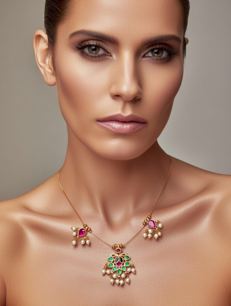 Make a statement with the Amara Handcrafted Jadau Necklace. Featuring a stunning peacock leaf-shaped pendant in green and magenta, this designer piece blends traditional artistry with modern elegance. Ideal for weddings, festive occasions, or gifting.