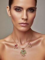 Be the first to review “Amara Handcrafted Designer Jadau Necklace with Peacock Leaf Pendant” Cancel reply