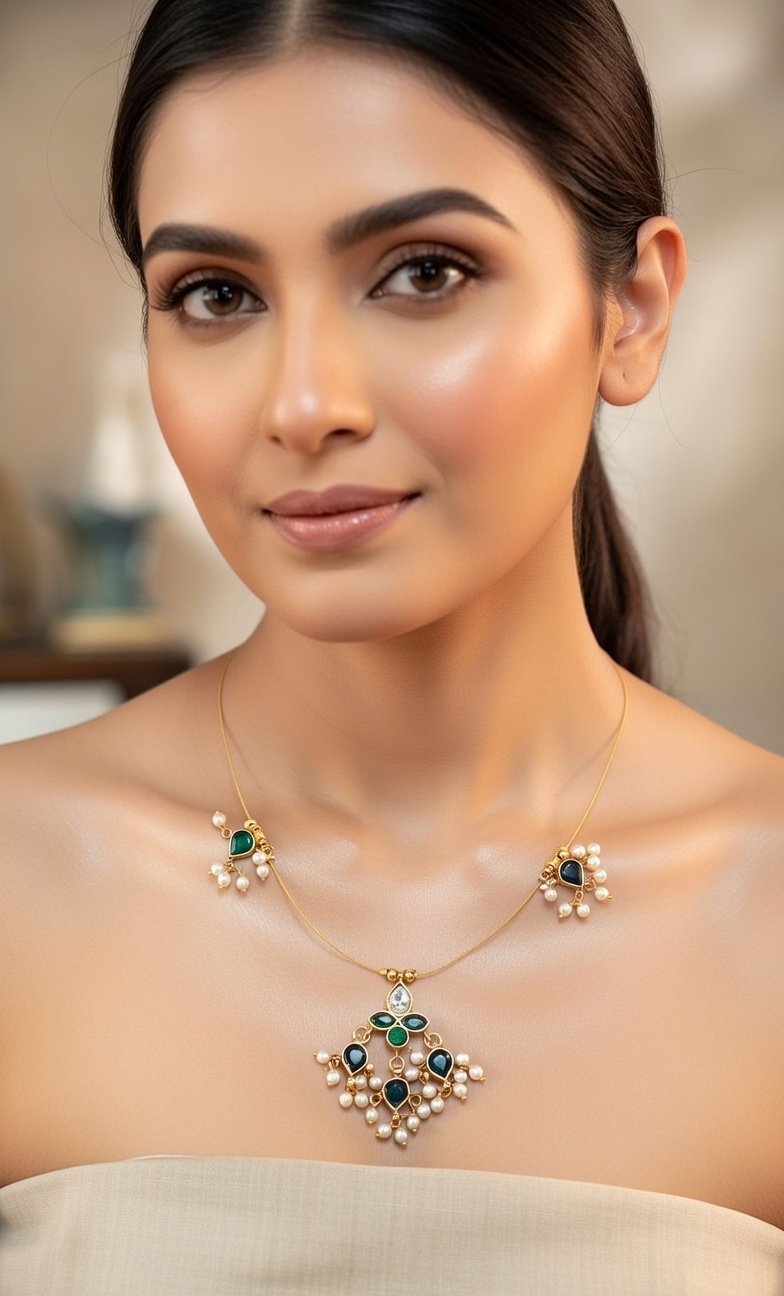 Add sophistication with the Amara Handcrafted Jadau Necklace. Featuring a central pendant and four prominent side beads (two on each side), this designer piece blends traditional craftsmanship with modern charm. Perfect for weddings, festive occasions, or gifting.