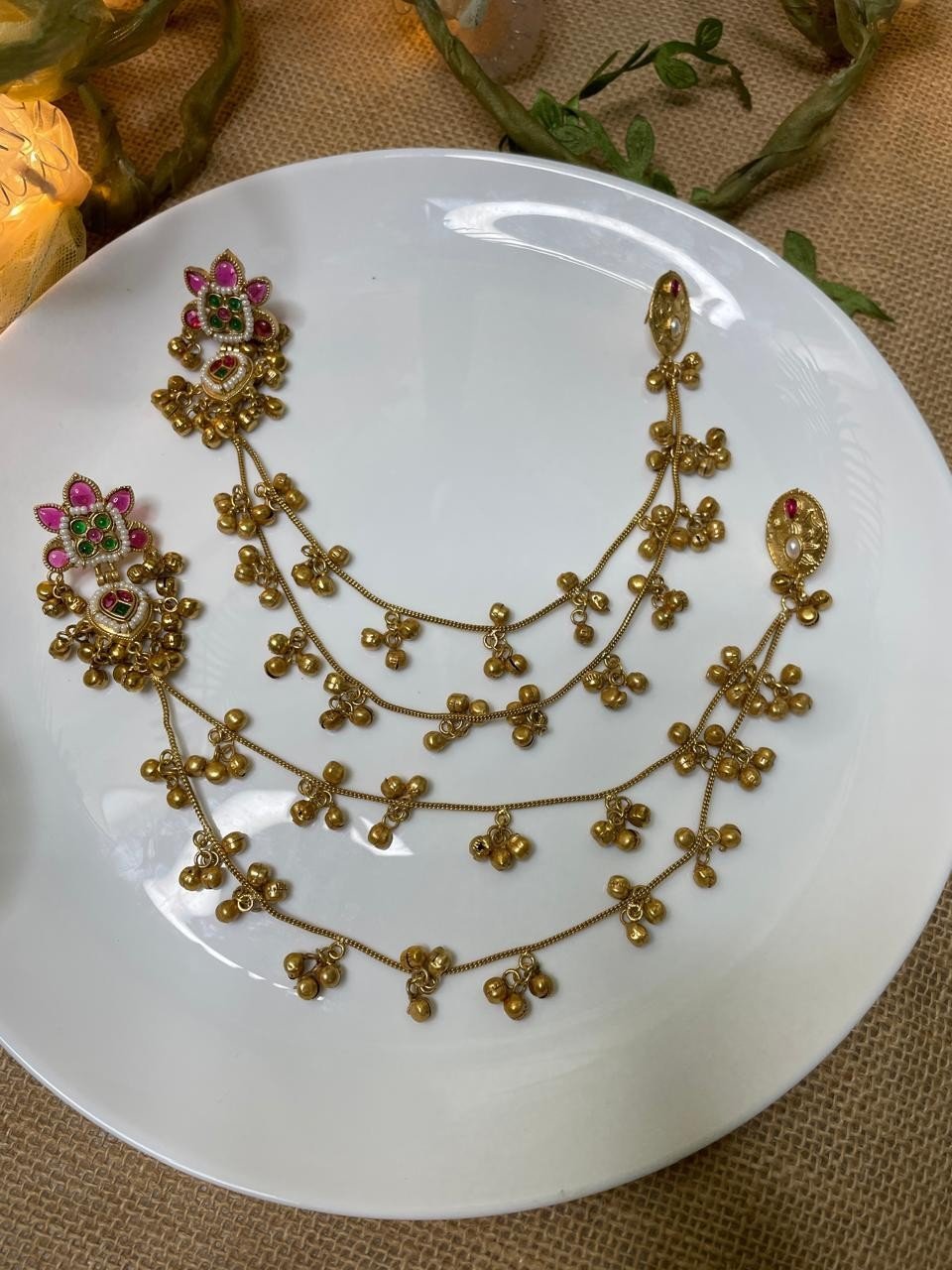 Home Exclusive Collection Festive & wedding blush Shahi Premium Stone Gold Plated Kashmiri Ear Chain (Sahara) Drops